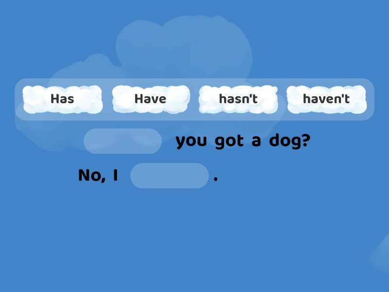 ____ you got a dog? No, I ____. ____ you got a sister? Yes, ____ have. ____ your dog got brown spots? Yes, ____ has. ____ your dad ____ a car? No, ____ ____. ____ they ____ a small cat? Yes, ____ have.