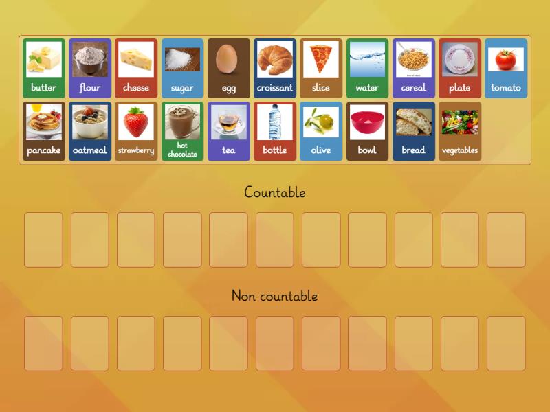 Countable: strawberry , plate, bottle, vegetables , olive , tomato, egg, croissant, pancake, bowl , slice , Non countable: water, bread, butter, sugar, oatmeal, flour , tea , cheese, cereal, hot chocolate ,