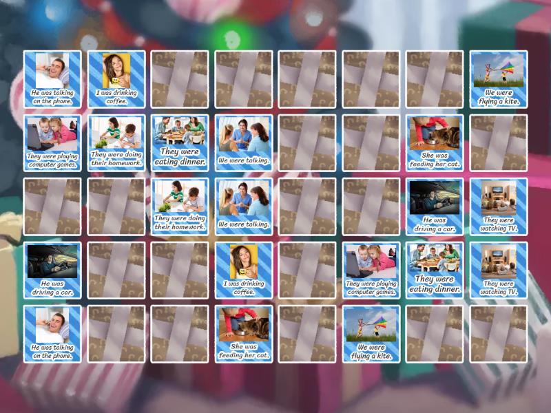 They were watching TV., He was driving a car., She was feeding her cat., He was talking on the phone., They were eating dinner., They were doing their homework., They were playing computer games., We were flying a kite., I was drinking coffee., We were talking. , It was flying., He was having a shower., He was sleeping., I was writing a letter., They were fixing her bike., He was riding a scooter., He was taking a medicine., It was snowing., I was washing the dishes., She was walking the dogs.,