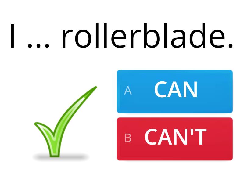 1) I ... rollerblade. a) CAN b) CAN'T 2) I ... ice skate. a) CAN b) CAN'T 3) ... you dive? a) CAN b) CAN'T 4) He ... row. a) CAN b) CAN'T 5) She ... ride a bike. a) CAN b) CAN'T 6) ... you play table tennis? a) CAN b) CAN'T 7) Yes, he ... a) CAN b) CAN'T 8) No, she ... a) CAN b) CAN'T