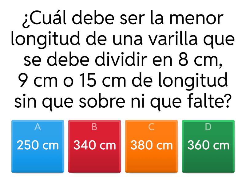 1) ¿Cuál debe ser la menor longitud de una varilla que se debe dividir en 8 cm, 9 cm o 15 cm de longitud sin que sobre ni que falte? a) 250 cm b) 340 cm c) 380 cm d) 360 cm 2) Se tienen tres cajas de 54, 72 y 90 kg de cobre respectivamente, los cuales se envasarán en bloques de modo que tengan el mismo peso y el mayor posible. ¿Cuánto pesa cada bloque de cobre? a) 15 kg b) 16 kg c) 18 kg d) 20 kg 3) Tres galgos arrancan juntos en una carrera en la que la pista es cerrada. Si el primero tarda 6 segundos en dar la vuelta, el otro 8 segundos y el tercero 10 segundos. ¿Al cabo de cuántos segundos pasarán otra vez juntos por la línea de salida? a) 140 segundos b) 150 segundos c) 120 segundos d) 110 segundos