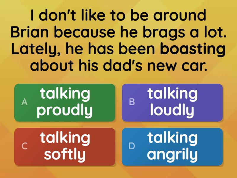 1) I don't like to be around Brian because he brags a lot. Lately, he has been boasting about his dad's new car. a) talking proudly b) talking loudly c) talking softly d) talking angrily 2) My family likes to hike. Someday, we plan to trek through the Grand Canyon. a) b) c) d) 3) I need to get a baseball cap to block the sun's glare. The sunlight is so bright that I can't even see the ball. a) b) c) d) 4) I detest broccoli. What food do you really dislike? a) like b) doesn't like c) cook d) buy 5) "Stop gawking at her," said Mom. "It's not polite to stare." a) b) c) d) 6) My ailing grandmother has been sick for months. a) strong b) active c) weak d) healthy 7) There had been no rain in the town for four months. The parched earth was cracked and dry. a) b) c) d) 8) Mom doesn't like shopping in December because the mall is too congested.  There are too many people! a) b) c) d)