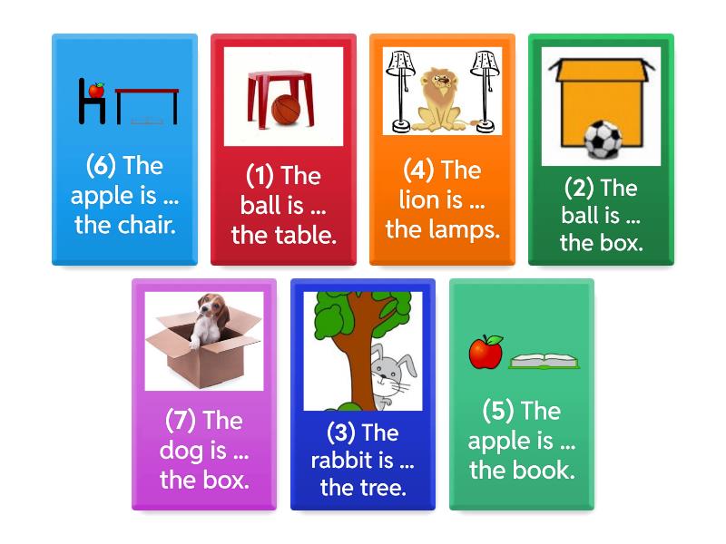 (1) The ball is ... the table. - under, (2) The ball is ... the box. - in front of, (3) The rabbit is ... the tree. - behind, (4) The lion is ... the lamps. - between, (5) The apple is ... the book. - next to, (6) The apple is ... the chair. - on, (7) The dog is ... the box. - in,