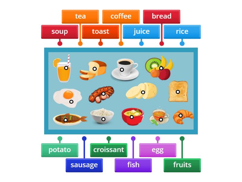 juice, bread, coffee, fruits, egg, sausage, potato, toast, fish, rice, soup, tea, croissant.