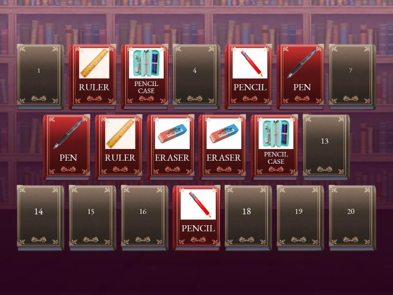 RULER, ERASER, PENCIL, PEN, PENCIL CASE, SCISSORS, GLUE, CRAYONS, SHARPENER, MARKERS,