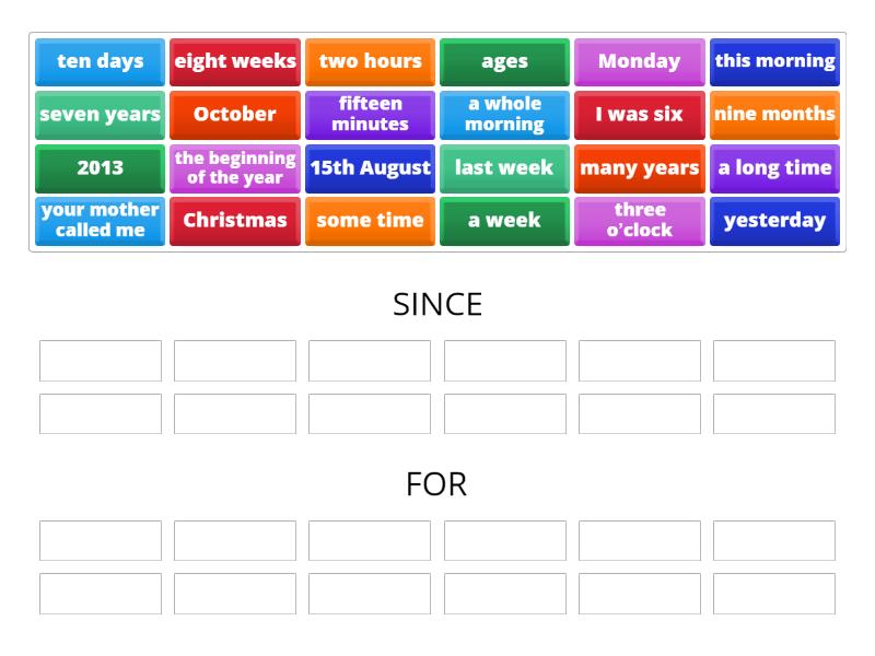 SINCE: Monday, last week, yesterday, Christmas, October, I was six, three o’clock, your mother called me, 15th August, the beginning of the year, this morning, 2013, FOR: a long time, ages, two hours, ten days, seven years, fifteen minutes, a week, some time, eight weeks, many years, nine months, a whole morning,