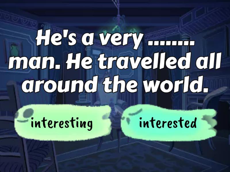 1) He's a very ........ man. He travelled all around the world. a) interesting b) interested 2) I'm ......... in learning new languages a) interesting b) interested 3)  The weather on this season is so ...... a) depressed b) depressing 4) I will be very ........ if Jason shows up. a) surprised b) surprising 5) My day was extremely ...... a) exhausting b) exhausted 6) The movie was so ........ that I felt asleep in the cinema. a) bored b) boring 7) I'm really ....... I have no idea what to do.  a) confusing b) confused 8) The youth isn't very...... in politics. a) interested b) interesting 9) Seeing Jason's ressurrection was really ........ a) excited b) exciting 10) The plot of the movie was extremely .......  a) confused b) confusing 11) They are always ......... in the morning a) tiring b) tired 12) It's very ....... when you need to repeat what you've just said a) tired b) tiring 13) I like her, but sometimes her voice is .............. a) annoying b) annoyed 14) Most people think Friday the 13th movies are ......, but I don't. a) frightened b) frightening 15) I got ........... when I heard the news about the war a) shocking b) shoked 16) Roller coasters are very ....... a) excited b) exciting