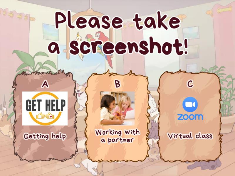 1) Please take a screenshot! a) Getting help b) Working with a partner c) Virtual class 2) I don't understand, can you help me? a) Getting help b) Working with a partner c) Virtual class 3) How do you pronounce this? a) Getting help b) Working with a partner c) Virtual class 4) What's the meaning of ....? a) Getting help b) Working with a partner c) Virtual class 5) How do you spell .....? a) Getting help b) Working with a partner c) Virtual class 6) A: Do you want to be A or B? / B: I'll be A, you can be B. a) Getting help b) Working with a partner c) Virtual class 7) A: I am ready. Are you ready? / B: No, just a minute - Yes, I am ready a) Getting help b) Working with a partner c) Virtual class 8) How do you say ....? a) Getting help b) Working with a partner c) Virtual class 9) Could you please turn your cameras on? a) Getting help b) Working with a partner c) Virtual class 10) I am sorry, can you repeat that please? a) Getting help b) Working with a partner c) Virtual class 11) A: Can you speak louder? / B: Yes, let me check my microphone a) Getting help b) Working with a partner c) Virtual class 12) A: Let's do the activity again / B: OK. Let's change roles. a) Getting help b) Working with a partner c) Virtual class 13) Can you say that again, please? a) Getting help b) Working with a partner c) Virtual class 14) Can you explain the activity again, please? a) Getting help b) Working with a partner c) Virtual class 15) A: What do you have for number one? / B: I have .... a) Getting help b) Working with a partner c) Virtual class 16) What's the word for ..... in English? a) Getting help b) Working with a partner c) Virtual class 17) A: Can you hear me? / B: Yes, I can / No, I can't a) Getting help b) Working with a partner c) Virtual class 18) A: You go first. / B: Ok, I'll go first. a) Getting help b) Working with a partner c) Virtual class 19) A: Can you share the screen? / B: Sure! a) Getting help b) Working with a partner c) Virtual class