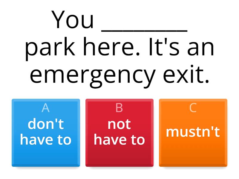 1) Students ________ wear uniforms at school. a) should b) have to c) must to 2) You ________ write the report. I've already done it. a) don't have to b) mustn't c) have to not 3) You _______ smoke here. It's against the rules! a) don't have to b) shouldn't c) mustn't 4) Sue missed her train yesterday and she __________ wait two hours for the next one. a) have to b) had to c) must 5) Children ____________speak to strangers. a) Musn't b) shouldn't c) not have to 6) During an interview you __________ use formal language! a) have to b) should c) musn't 7) Tom is lucky. He ________ get up early on Monday mornings because he starts working at 10 a.m a) doesn't need to b) mustn't c) doesn't has 8) When we were at school we ________ wear a uniform. a) must b) didn't have to c) have to 9) You __________ be an expert to organise a zoom meeting. a) mustn't b) don't had to c) don't have to 10) These samples are free. You _________ pay. a) don't have to b) mustn't c) can't 11) You ________ park here. It's an emergency exit. a) don't have to b) not have to c) mustn't 12) You ________ drink coffee at night if you want to sleep properly. a) can't b) mustn't c) shouldn't 13) People____________ forget to wear a mask to go out these days. a) mustn't b) don't have to c) have to not 14) You______________finish the sales report by monday or your boss is going to be really mad! a) should b) need to c) do not have to 15) While in hospital waiting rooms you ___________speak in a low voice. a) has to b) should c) must