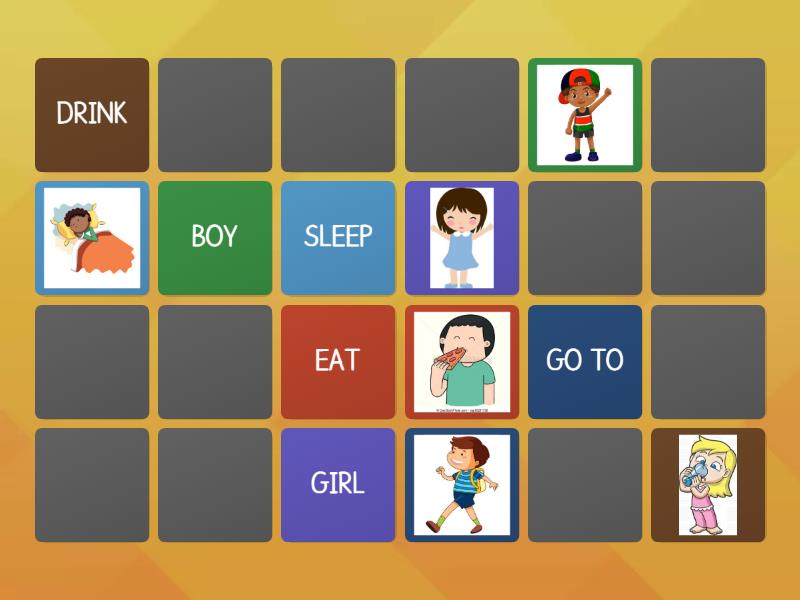 BOY, GIRL, EAT, SLEEP, DRINK, GO TO, WATCH, WATER, PLAY, HOUSE, JUICE, BREAD,