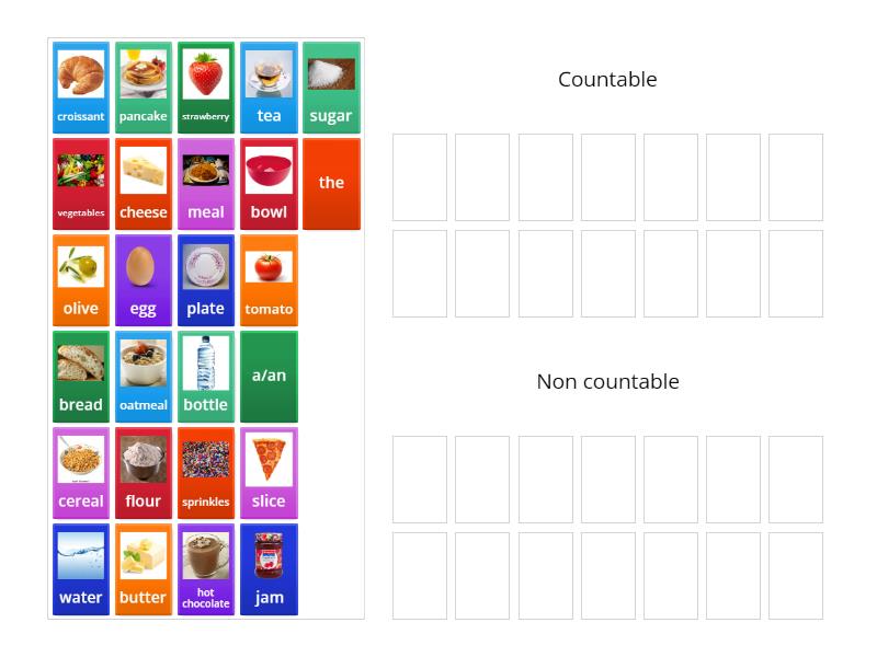 Countable: strawberry , plate, bottle, meal, vegetables , olive , tomato, egg, croissant, pancake, bowl , slice , a/an, the , Non countable: water, bread, butter, sugar, oatmeal, flour , tea , jam, cheese, cereal, hot chocolate , sprinkles ,