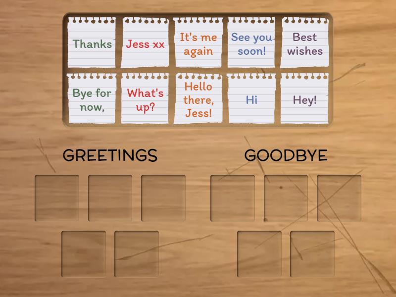 GREETINGS: Hi, Hello there, Jess!, Hey!, What's up?, It's me again, GOODBYE: See you soon!, Jess xx, Bye for now,, Best wishes, Thanks,