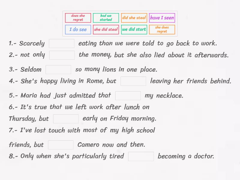 1.- Scarcely ____ eating than we were told to go back to work. 2.- not only ____ the money, but she also lied about it afterwards. 3.- Seldom ____ so many lions in one place. 4.- She's happy living in Rome, but ____ leaving her friends behind. 5.- Maria had just admitted that ____ my necklace. 6.- It's true that we left work after lunch on Thursday, but ____ early on Friday morning. 7.- I've lost touch with most of my high school friends, but ____ Camero now and then. 8.- Only when she's particularly tired ____ becoming a doctor.