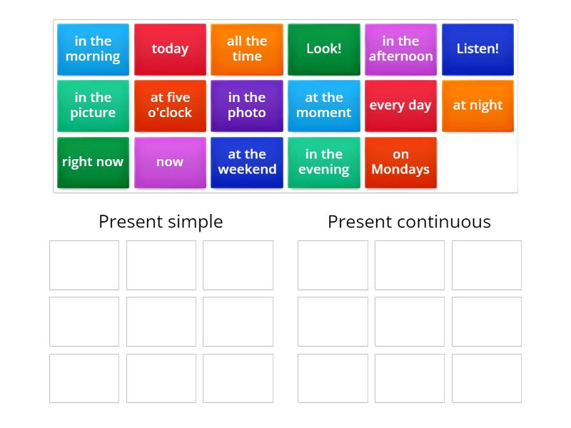 Present simple: every day, on Mondays, in the morning, at five o'clock, at the weekend, in the afternoon, in the evening, all the time, at night, Present continuous: now, right now, today, at the moment, in the picture, in the photo, Look!, Listen!,