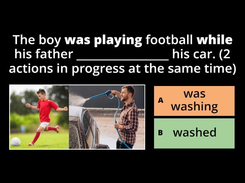 1) The boy was playing football while his father _________________ his car. (2 actions in progress at the same time) a) was washing b) washed 2) I _____________ while my mother _________________ dinner. (2 actions in progress at the same time) a) studied / cooked b) was studying / was cooking 3) He ______________ tennis while we _____________ rugby. (2 actions in progress at the same time) a) was playing / played b) was playing / were playing 4) I ____________ attention while the teacher_____________. (2 actions in progress at the same time) a) wasn't paying / spoke b) wasn't paying / was speaking c) didn't pay / spoke 5) They were having a picnic in the park ______ it started to rain! a) while b) when 6) _______ I was walking my dog, a cat appeared. a) When b) While 7) He was sleeping ________ his boss called him. a) while b) when 8) My dog suddenly barked loudly ______ I was doing my homework. a) while b) when 9) The girl _________ a horror movie when she suddenly _________. a) was watching / screamed b) was watching / was screaming 10) The woman _____________ TV when the lights ___________ out. a) watched / went b) was watching / were going c) was watching / went