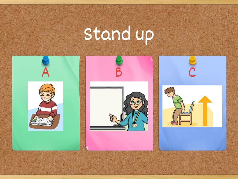 1) Stand up a) b) c) 2) Cut a) b) c) 3) Sing a) b) c) 4) Read a) b) c) 5) Sit down a) b) c) 6) Be quiet a) b) c)