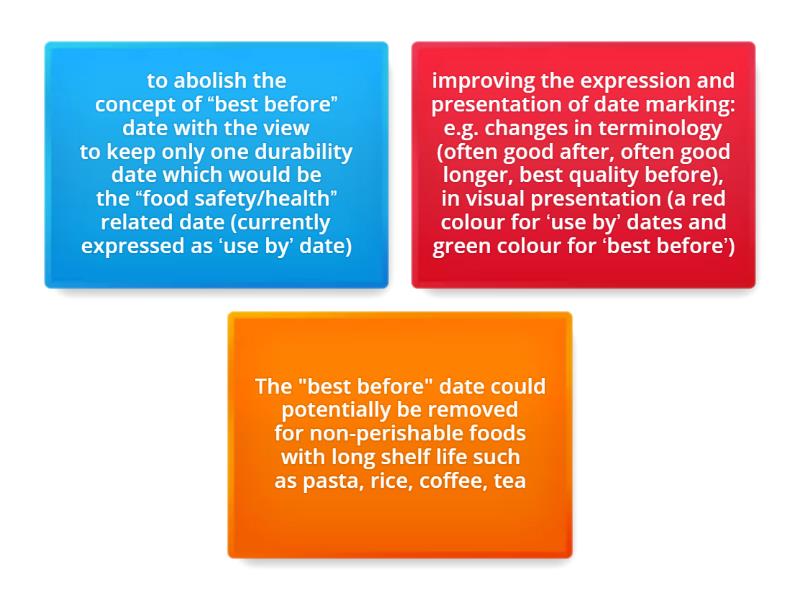 The "best before" date could potentially be removed for non-perishable foods with long shelf life such as pasta, rice, coffee, tea, to abolish the concept of “best before” date with the view to keep only one durability date which would be the “food safety/health” related date (currently expressed as ‘use by’ date) , improving the expression and presentation of date marking: e.g. changes in terminology (often good after, often good longer, best quality before), in visual presentation (a red colour for ‘use by’ dates and green colour for ‘best before’),