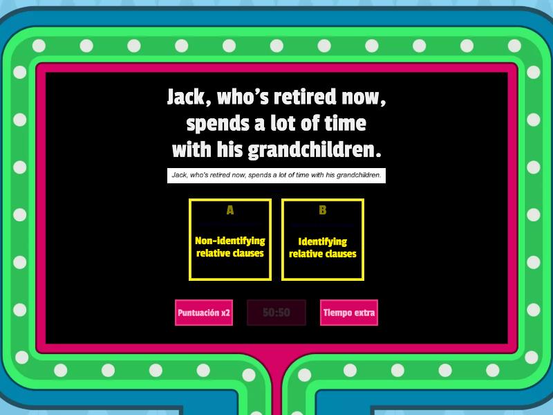 1) Jack, who's retired now, spends a lot of time with his grandchildren. a) Non-identifying relative clauses b) Identifying relative clauses 2) My sister, whose dog I'm looking after, is visiting a friend in Australia. a) Non-identifying relative clauses b) Identifying relative clauses 3) The man who stole my car has been arrested by the police. a) Non-identifying relative clauses b) Identifying relative clauses 4) The book which you see on the table cost me twenty dollars. a) Non-identifying relative clauses b) Identifying relative clauses 5) The house, which was built in 1883, has just been opened to the public. a) Non-identifying relative clauses b) Identifying relative clauses 6) The award was given to Sara, whose short story impressed the judges. a) Non-identifying relative clauses b) Identifying relative clauses 7) People who take physical exercise lead healthy lives. a) Non-identifying relative clauses b) Identifying relative clauses 8) John, who stood first in the examination, was given a prize. a) Non-identifying relative clauses b) Identifying relative clauses