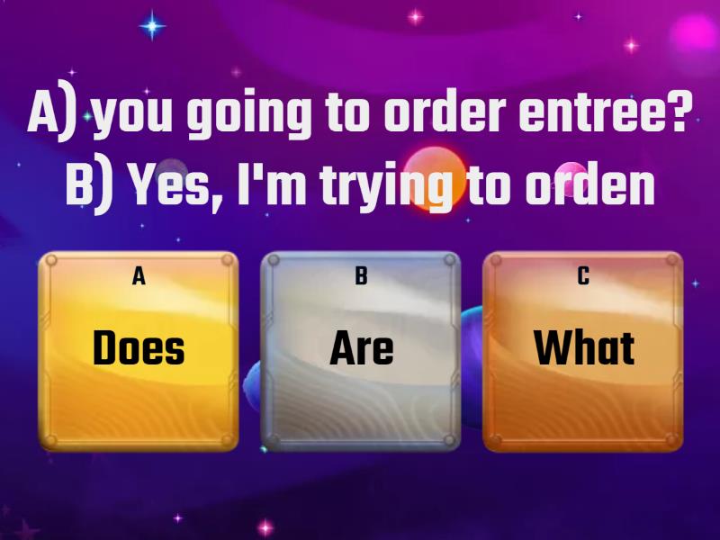 1) A) you going to order entree? B) Yes, I'm trying to orden a) Does b) Are c) What 2) Do you drink on weekend? a) Use to b) Used to 3) Does she to the beach on Summer? a) use to gone b) use to go c) used to going 4) What do you on weekend? a) use to does b) use to did c) use to do 5) Choose the correct sentence: Watch/ superhero/ but/movies/I/used to/ I don't/now a) I don't watch superhero movies but I used to now b) Superhero movies I used to wactch but now I don't c) I used to watch superhero movies but now I don't d) I use to watch superhero movies but now I don't 6) I write code when I worked for Elektra a) use to b) used to 7) When i was a child, I wacth a lot of television in canal five a) don't use to b) doesn't use to c) didn't use to 8) your sister use to study a lot when she was ay university? a) Do b) Does c) Did 9) I'm back home today after party a) used to go b) used to going c) use to going