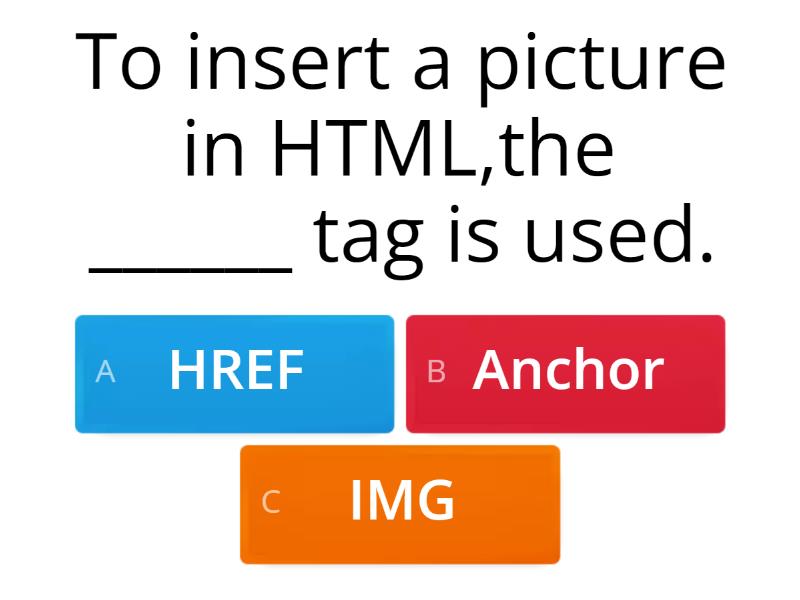 1) To insert a picture in HTML,the ______ tag is used. a) HREF  b) Anchor c) IMG 2) SRC stands for ________. a) Source b) Search sound  c) Submit 3) Pictures saved in GIF format are presented through ___________ lines. a) only horizontal   b) horizontal and vertical c) vertical lines 4) GIF stands for __________ . a) Graphic International Format Graphic Interface Format  b) Graphic Interchange Format c) Graphic Interchange Font 5) The size of a file saved in JPEG format is _________ GIF and BMP formats. a) less than b) greater than c) equal to 6) WAV and MIDI formats are related with ___________. a) JPEG Format b) GIF Format c) Sound 7) Human voices can be accurately recorded using the _______ format. a) AU b) MIDI c) WAV 8) HREF stands for _______. a) Hyper Text Reference b) Hyper Referential Text c) Hyper Recording Format 9) Protocols are a set of ________ . a) Information b) Instruction c) Rules 10) Domain Name is a name assigned to the _________. a) Web site b) Web page c) Web browser