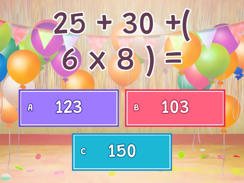 1) 25 + 30 +( 6 x 8 ) = a) 123 b) 103 c) 150 2) 12:4 + 5 x 8 = a) 49 b) 43 c) 30 3) 40 + 20 + 25 : 5 - 6 x 3 a) 56 b) 120 c) 47 4) ( 56 + 14) - 15 : 3 = a) 65 b) 56 c) 98 5) 48 : 6 + 10 x 5 = a) 46 b) 58 c) 72 6) 54 - 14 + 20 : 5 + 4 x 6 = a) 123 b) 52 c) 68 7) 5 + 3 - 4 + ( 6 x 7 ) - (18 : 3) = a) 40 b) 52 c) 48 8) 3 x 5 + (18 : 6) + 2 x 3 = a) 23 b) 24 c) 22 9) ( 5 x 8 ) + 21 : 7 + ( 25 - 8 )= a) 23 b) 48 c) 60 10) ¿Cúal es la prevalencia para resolver la operatoria combinada? a) 1° multiplicación y división, 2° paréntesis, 3° sumas y restas  b) 1° paréntesis, 2° multiplicación y división, 3° sumas y restas c) 1° paréntesis, 2° sumas y restas, 3° multiplicación y división 11) Si en mi ejercicio solo tengo divisiones y multiplicaciones ¿Cuál resuelvo primero? a) siempre multiplicación  b) siempre división  c) La que aparezca primero, de izquierda a derecha 12) Si en mi ejercicio solo tengo sumas y restas ¿Cuál resuelvo primero? a) siempre restas b) siempre sumas c) La que aparezca primero, de izquierda a derecha