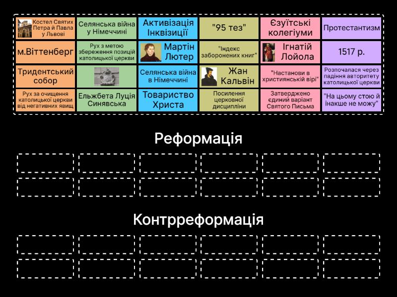 Реформація: Розпочалася через падіння авторитету католицької церкви, Мартін Лютер, "На цьому стою й інакше не можу", Рух за очищення католицької церкви від негативних явищ, "95 тез", Селянська війна у Німеччині, Жан Кальвін, м.Віттенберг, "Настанови в християнській вірі", 1517 р., Протестантизм, Селянська війна в Німеччині, Контрреформація: Рух з метою збереження позицій католицької церкви, Тридентський собор, Ігнатій Лойола, Активізація Інквізиції, Товариство Христа , "Індекс заборонених книг", Єзуїтські колегіуми, Костел Святих Петра й Павла у Львові, Посилення церковної дисципліни, Затверджено єдиний варіант Святого Письма, Ельжбета Луція Синявська, ,