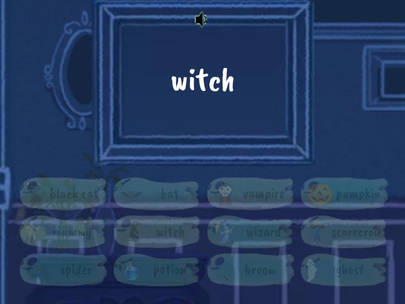 witch -  witch, potion -  potion, bat - bat, pumpkin - pumpkin, vampire - vampire, ghost - ghost, mummy - mummy, spider - spider, black cat - black cat, wizard - wizard, scarecrow - scarecrow, broom - broom,