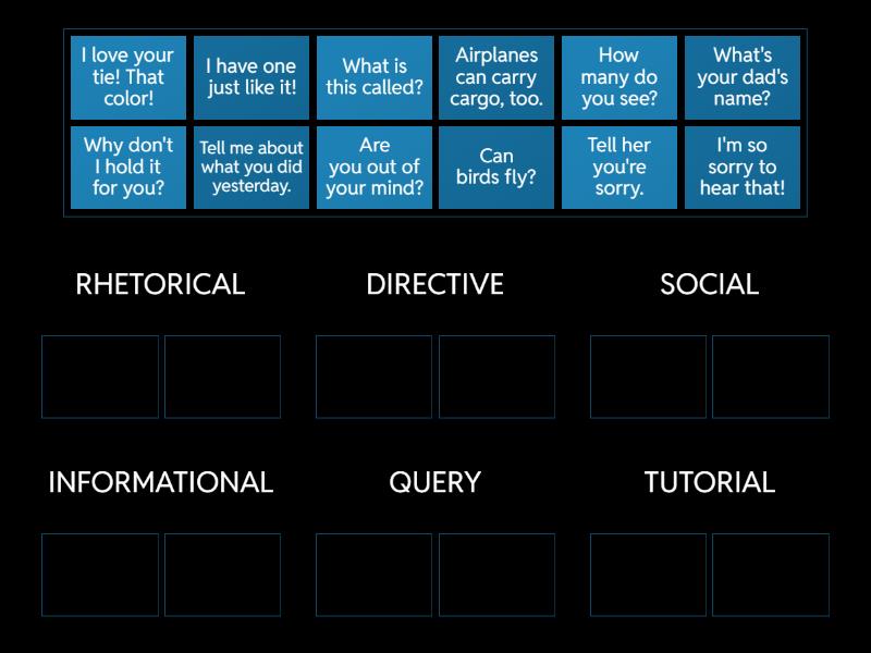 RHETORICAL: Are you out of your mind?, Can birds fly?, DIRECTIVE: Why don't I hold it for you?, Tell her you're sorry., SOCIAL: I love your tie! That color!, I'm so sorry to hear that!, INFORMATIONAL: I have one just like it!, Airplanes can carry cargo, too., QUERY: What's your dad's name? , Tell me about what you did yesterday., TUTORIAL: How many do you see?, What is this called?,