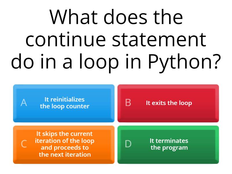 1) Given a string s = "abcdefg", write a Python code to extract the substring "aceg" (skipping every other character). a) s[:] b) s[ : : 2] c) s[ 2: : ] d) s=[ :2: ] 2) What does the continue statement do in a loop in Python? a) It exits the loop b) It skips the current iteration of the loop and proceeds to the next iteration c) It terminates the program d) It reinitializes the loop counter