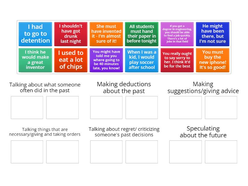 Talking about what someone often did in the past: When I was a kid, I would play soccer after school, I used to eat a lot of chips, Making deductions about the past: He might have been there, but I'm not sure, She must have invented it - I'm almost sure of it!, Making suggestions/giving advice: You must buy the new iphone! It's so good!, You really ought to say sorry to her. I think it'd be for the best, Talking things that are necessary/giving and taking orders: All students must hand their paper in before tonight, I had to go to detention , Talking about regret/ criticizing someone's past decisions : I shouldn't have got drunk last night, You might have told me you where going to be 40 minutes late, you know!, Speculating about the future: I think he would make a great inventor, If you get a degree in engineering, you should be able to find a job quickly. There's a lot of jobs in that field,
