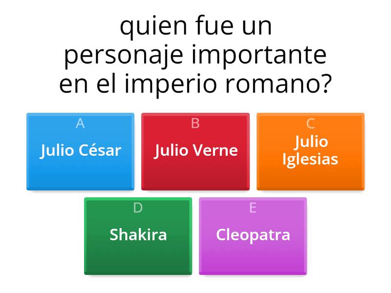 1) quien fue un personaje importante en el imperio romano? a) Julio César b) Julio Verne c) Julio Iglesias d) Shakira e) Cleopatra 2) ¿Qué tipo de galleta predice tu futuro por una hoja de papel que trae adentro? a) galletas maria tostada b) galleta marbu c) oreo d) galleta de la suerte e) cucas f) galleta de la fortuna 3) ¿Cuándo acabó la II Guerra Mundial? a) el año pasado b) en el 2000 c) hace un 1.000.400 años a.C (antes de Cristo) d) cuando se extinguieron los dinosaurios e) en 1945 f) en los 90s 4) ¿En qué año murió Freddie Mercury? a) en 1843 b) En 1991. c) en 2020 (coronavirus) d) en en 400 a.C e) sigue vivo f) lo secuestraron los extraterrestres, no se sabe nada de el 5) ¿En qué país se usó la primera bomba atómica? a) en España (Benidorm) b) En Japón (Hiroshima) c) en China (PEKÍN) d) Londres e) New York(torres gemelas) f) Venuzuela 6) ¿Cuántos huesos hay en el cuerpo humano? a) 387 b) 2005 c) 200 d) 206 e) 300 f) 100 7) ¿Quién pintó 'La última cena'? a) Vincent Van Gogh b) Fredie Mercury c) Frida khalo d) Leonardo DaVinci. e) Pablo Picasso f) Plabo Escobar 8) ¿Cuál es el primer libro de la Biblia? a) Génesis b) la biblia(primera parte) c) apocalipsis d) la arca de moises e) adan y eva f) la creacion 9) ¿Cuál es el club de fútbol con más Champions? a) el atletic club b) el celta c) El Real Madrid d) arenteeeiro e) manchester city 10) De quién es la canción 'Love me Tender'? a) De Elvis Presley. b) De David Robert Jones. c) De Rihana d) De Ed Sheran e) De David Bowie f) De The Beatles
