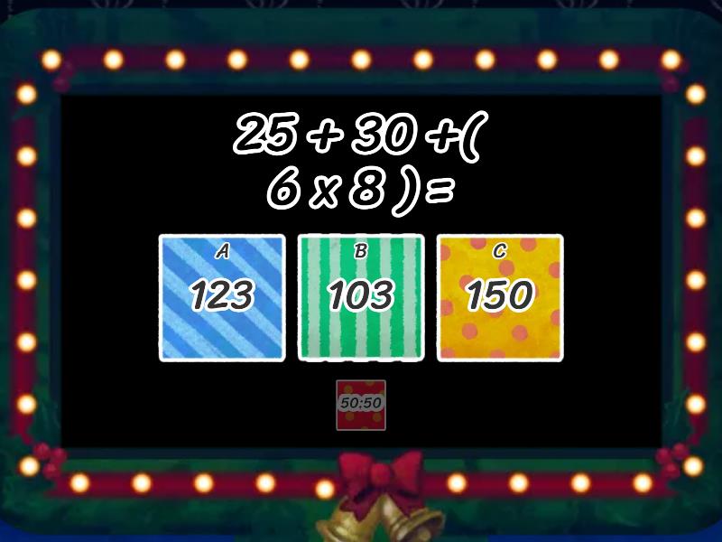 1) 25 + 30 +( 6 x 8 ) = a) 123 b) 103 c) 150 2) 12:4 + 5 x 8 = a) 49 b) 43 c) 30 3) 40 + 20 + 25 : 5 - 6 x 3 a) 56 b) 120 c) 47 4) ( 56 + 14) - 15 : 3 = a) 65 b) 56 c) 98 5) 48 : 6 + 10 x 5 = a) 46 b) 58 c) 72 6) 54 - 14 + 20 : 5 + 4 x 6 = a) 123 b) 52 c) 68 7) ( 5 x 8 ) + 21 : 7 + ( 25 - 8 )= a) 23 b) 48 c) 60 8) 400 es igual a a) 500 - 100 b) 400 + 200 c) 100 - 50 9) ¿Cuánto le debo sumar a 17 para obtener 25? a) 6 b) 7 c) 8 10) ¿Cuánto le debo quitar a 30 para obtener 20? a) 5 b) 8 c) 10