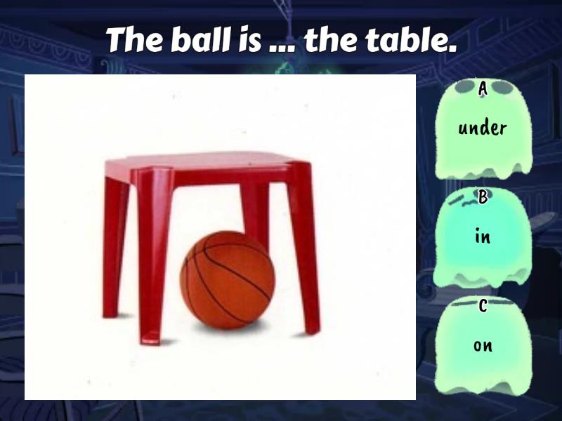 1) The ball is ... the table. a) under b) in c) on 2) The apple is ... the book. a) on b) next to 3) The apple is ... the chair. a) in b) next to c) on 4) The dog is ... the box. a) in b) on