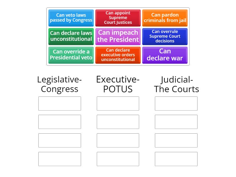 Legislative- Congress: Can impeach the President, Can override a Presidential veto, Can declare war, Can overrule Supreme Court decisions, Executive- POTUS: Can appoint Supreme Court Justices, Can veto laws passed by Congress, Can pardon criminals from jail, Judicial- The Courts: Can declare laws unconstitutional, Can declare executive orders unconstitutional,