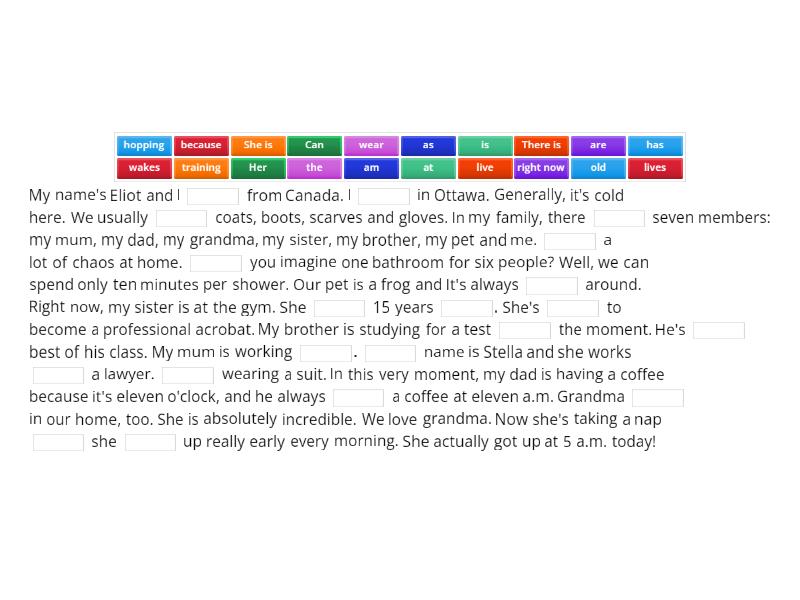 My name's Eliot and I ____ from Canada. I ____ in Ottawa. Generally, it's cold here. We usually ____ coats, boots, scarves and gloves. In my family, there ____ seven members: my mum, my dad, my grandma, my sister, my brother, my pet and me. ____ a lot of chaos at home. ____ you imagine one bathroom for six people? Well, we can spend only ten minutes per shower. Our pet is a frog and It's always ____ around. Right now, my sister is at the gym. She ____ 15 years ____. She's ____ to become a professional acrobat. My brother is studying for a test ____ the moment. He's ____ best of his class. My mum is working ____. ____ name is Stella and she works ____ a lawyer. ____ wearing a suit. In this very moment, my dad is having a coffee because it's eleven o'clock, and he always ____ a coffee at eleven a.m. Grandma ____ in our home, too. She is absolutely incredible. We love grandma. Now she's taking a nap ____ she ____ up really early every morning. She actually got up at 5 a.m. today!