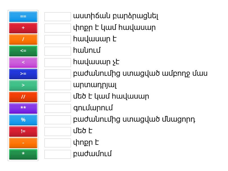 // - բաժանումից ստացված ամբողջ մաս, % - բաժանումից ստացված մնացորդ, * - արտադրյալ, / - բաժամում, ** - աստիճան բարձրացնել, == - հավասար է, != - հավասար չէ, > - մեծ է, < - փոքր է, >= - մեծ է կամ հավասար, <= - փոքր է կամ հավասար, + - գումարում, - - հանում,