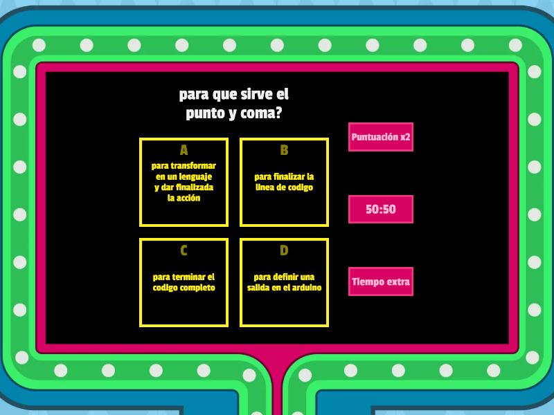 1) para que sirve el punto y coma? a) para transformar en un lenguaje y dar finalizada la acción b) para finalizar la linea de codigo c) para terminar el codigo completo d) para definir una salida en el arduino 2) con que palabra se define una variable a) int b) pinMode c) OUTPUT d) avanzar derecha 3) Cuál es la palabra donde se define las acciones de la programacion a) Void setup() { b) digitalWrite() c) LOW d) Void loop () { 4) cual es la palabra correcta donde se definen los estados de una variable  a) void setup() { b) digitalWrite c) delay() d) analogWrite e) void loop() { 5) para que sirve la palabra digitalWrite  a) para una escritura digital b) para una lectura digital c) para un codigo binario d) para una escritura digital que funciona como codigo binario 6) cual es la funcion de LOW y HIGH a) bajo y alto b) apagado y encendido c) 0 y 1 d) todas las anteriores