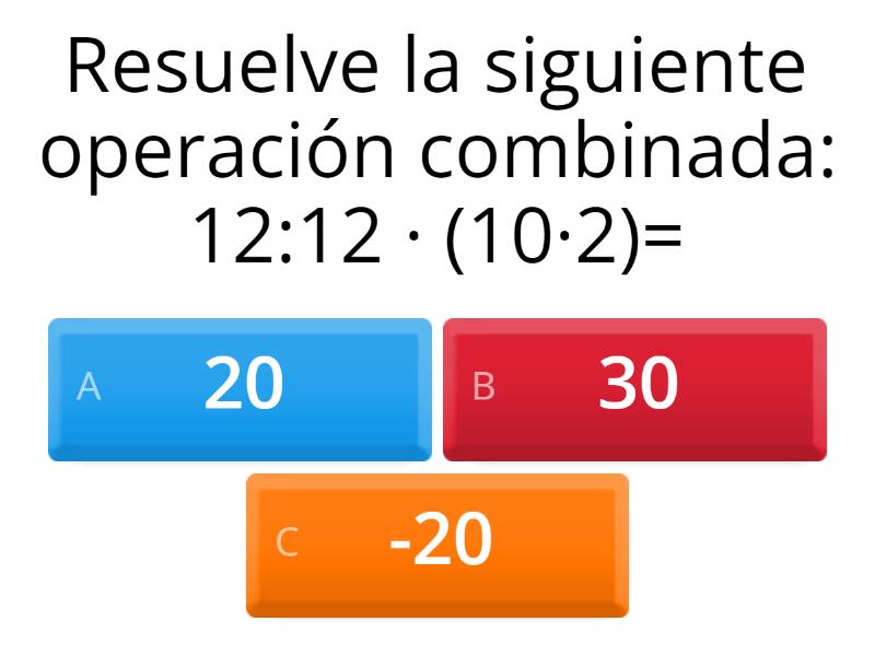 1) Resuelve la siguiente operación combinada: 12:12 · (10·2)=  a) 20 b) 30 c) -20 2) Resuelve la siguiente operación combinada: 25:5 + 10 · 4 = a) -44 b) 45 c) -54 3) Resuelve la siguiente operación combinada: 500 : 5 + 25 · 6 =  a) 250 b) -250 c) 25 4) Resuelve la siguiente operación combinada: (45+5) : (13 -3) =  a) 5 b) -5 c) 16 5) Resuelve la siguiente operación combinada: 3 · ( 6+2 -5) - 12 : 6 =  a) -7 b) 17 c) 7 6) El orden correcto en la jerarquización de las operaciones es: a) adición, sustración, paréntesis, potencias, multiplicación y división. b) paréntesis, potencias y raices, multiplicación y división y adición y sustracción. c) parentesis, multiplicación y división, potencias y raíces, sustracción y adición. 7) En la siguiente operación combinada 100 + 24 + 35 : 2 = que debo realizar primero a) división y luego la adición  b) adición de izquierda a derecha