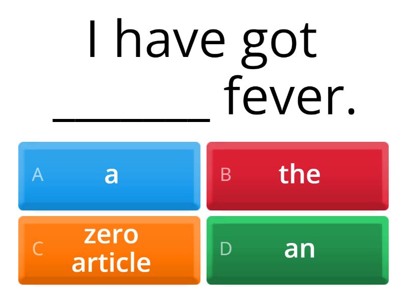 1) I have got _______ fever. a) the b) zero article c) a d) an 2) ________ man I told you about is right there. a) the b) zero article c) a d) an 3) _______ Oxford Street is Europe's busiest shopping street. a) the b) zero article c) a d) an 4) There´s an a in "I haven´t seen her in a while" because... a) It´s a specific thing. b) It´s a non-specific thing. c) It´s general. d) It´s a set expression. 5) They couldn´t find the car keys and came on _________ foot. a) the b) zero article c) a d) an 6) Sometimes I play ______ guitar a) the b) zero article c) a d) an 7) In order to decide a destination, I usually take___________ suggestions. a) the b) zero article c) a d) an