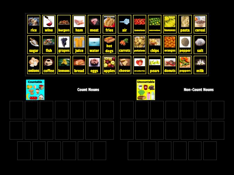 Count Nouns: apples, bananas, carrots, eggs, burgers, donuts, tomotoes, potatoes, lemons, hot dogs, grapes, strawberries, chips, fries, onions, fish, watermelons, oranges, pears, peppers, Non-Count Nouns: pasta, bread, water, rice, juice, cereal, air, ham, milk, coffee, sugar, salt, pepper, meat, cheese, wine,
