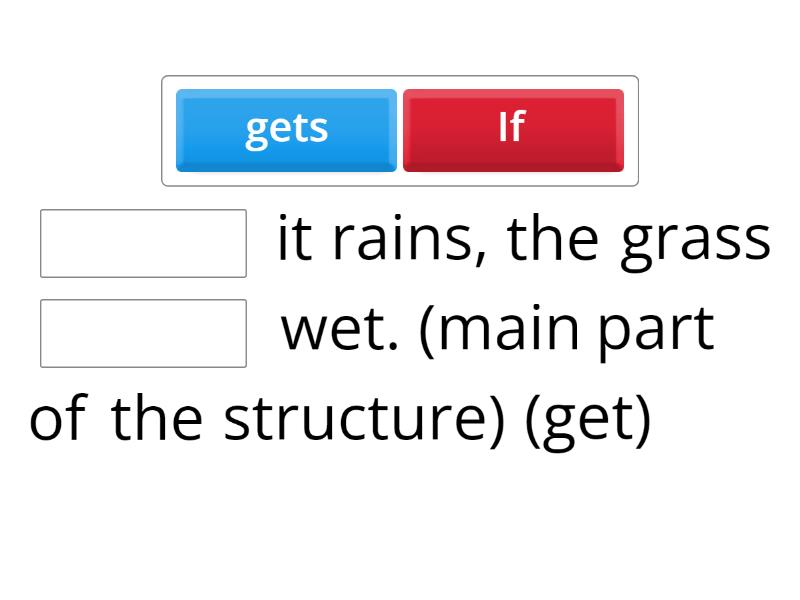 ____ it rains, the grass ____ wet. (main part of the structure) (get) Ice ____ ____ you heat it. (melt) (main part of the structure) ____ you freeze water____ becomes a solid. (be) If you ____ to come, ____ me before 5:00. (want) (call) If you ____ red and blue, you ____ purple. (mix) (get) Ask Pete ____ you____ not sure what to do. (v. to be short form) ____ we get separated____ me here. (meet) ____ Bill phones____ him to meet me at the cinema. (tell)