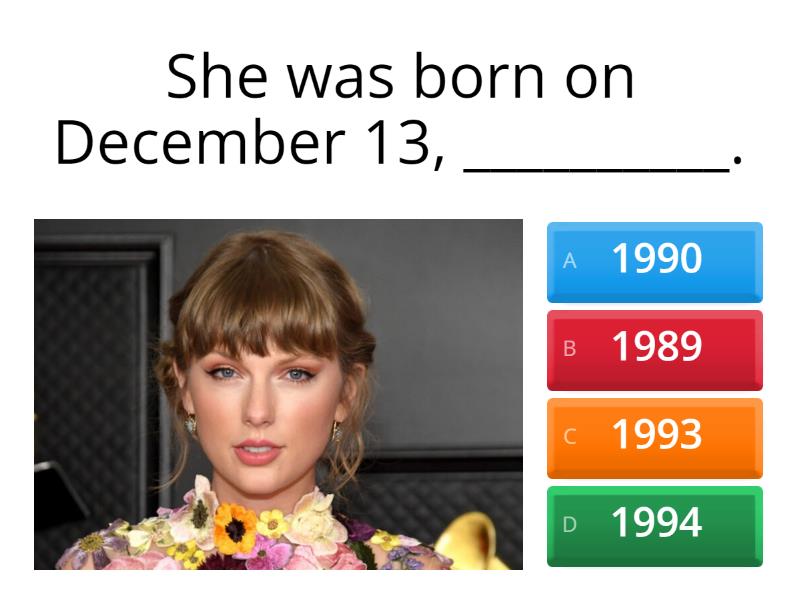 1) She was born on December 13, __________. a) 1990 b) 1989 c) 1993 d) 1994 2) Her full name is _________. a) Taylor Swift b) Taylor Jansen Swift c) Taylor Alison Swift d) Taylor Adkins Swift 3) What's Taylor Swift's favorite animal? a) cat b) dog c) fish d) hamster 4) Taylor has three cats. What are their names? a) Baby, Sally and Gina. b) Olivia, Sally and Gina. c) Olivia, Meredith and Benjamin. d) Meredith, Benjamin and Sally. 5) Which instruments does Taylor play? a) The guitar and the drums. b) The guitar and the flute. c) The guitar and the recorder. d) The guitar and the piano. 6) Taylor has a lucky number. Which one is it? a) 6 b) 12 c) 13 d) 22 7) What's Taylor Swift's favorite food? a) chicken tenders b) cupcakes c) French fries d) salad 8) How tall is Taylor Swift? a) 1,75 m b) 1,80 m c) 1,60 m d) 1,90 m 9) Where was she born? a) New York City b) Los Angeles c) West Reading d) Orlando 10) What's Taylor Swift's favorite color? a) red b) orange c) pink d) purple 11) How old is Taylor Swift? a) 33 b) 34 c) 35 d) 36 12) How many Youtube subscribers does Taylor Swift have? a) 47.6 million b) 50 million c) 52 million d) 57.9 million 13) How many TikTok followers does Taylor Swift have? a) 28.6 million b) 29 million c) 21 million d) 13 million