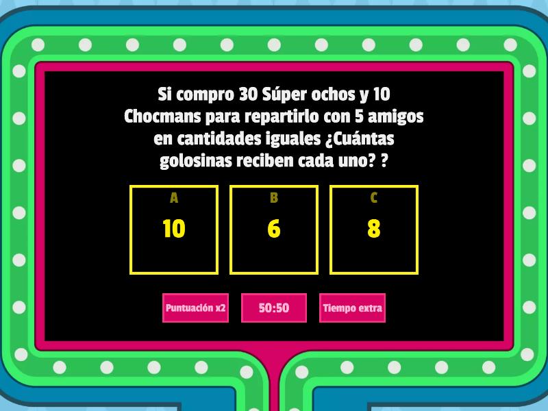 1) Si compro 30 Súper ochos y 10 Chocmans para repartirlo con 5 amigos en cantidades iguales ¿Cuántas golosinas reciben cada uno? ? a) 10 b) 6 c) 8 2) Si el Jere klein cobra 200.000 pesos por concierto y le da a su mamá 1/4 ¿Cuánto dinero recibe su mamá por 4 conciertos? a) 100.000 b) 150.000 c) 200.000 3) En el complejo deportivo de labranza existe un negocio que vende al rededor de 200.000 pesos diarios los sábados y los domingos. Esto es diferente en los días de lunes a viernes donde alcanza ventas de 50.000 pesos diarios. si esta información la utilizamos para calcular la cantidad de ventas en 2 semanas ¿Cuánto dinero recibiría por las ventas?   a) 1.000.000 b) 1.500.000 c) 1.300.000 4) (5+4+1+10-11) x 2 a) 10 b) 18 c) 20 5) (8x3) - (9x2) a) 6 b) 8 c) 9