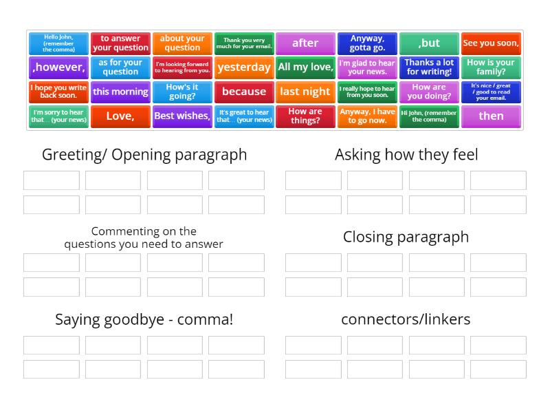 Greeting/ Opening paragraph : It’s nice / great / good to read your email., I’m glad to hear your news., It’s great to hear that… (your news), I’m sorry to hear that… (your news), Thanks a lot for writing!, Thank you very much for your email. , Hi John, (remember the comma) , Hello John, (remember the comma), Asking how they feel: How's it going?, How are you doing?, How are things? , How is your family? , Commenting on the questions you need to answer: as for your question , about your question , to answer your question, Closing paragraph: Anyway, I have to go now., Anyway, gotta go., I really hope to hear from you soon., I’m looking forward to hearing from you., I hope you write back soon. , Saying goodbye - comma!: Best wishes, , Love, , See you soon, , All my love,, connectors/linkers: then, after, yesterday, this morning , last night, because, ,but, ,however,,