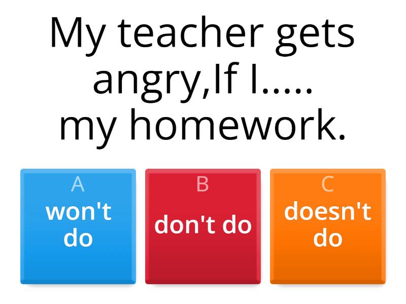 1) My teacher gets angry,If I..... my homework. a) won't do b) don't do c) doesn't do 2) My little sister ...... if she has a nightmare (pesadilla). a) will cry b) cries c) cry 3) If I get lost, I ......you. a) will call b) call c) calls 4) If you ......... too much alcohol, you'll get drunk. a) will drink b) drinks c) drink 5) If you mix blue and yellow, you .............. green  a) will get b) get c) gets 6) If the day is sunny tomorrow, we .......... to the park. a) will go b) go c) goes 7) People get fined (multada), if they .....................taxes (impuestos). a) won't pay b) don't pay c) doesn't pay 8) If we take the train, we ........there soon. a) will get b) get c) gets 9) If it rains, we .......the football match. a) will cancel b) cancel c) cancels 10) If you study hard, you .................. the exam. a) will pass b) passes c) pass 11) If my mum ...... (dar) me some money, I'll go to the party tonight. a) will give b) give c) gives 12) I ......................to the concert unless (a menos que) all my friend go. a) don't go b) go c) won't go