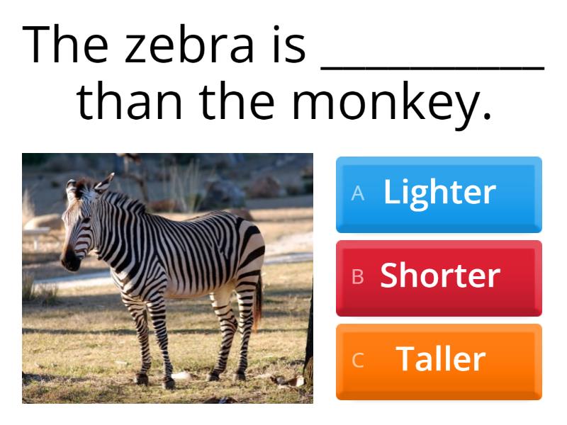 1) The zebra is __________ than the monkey. a) Lighter b) Shorter c) Taller 2) The lion is _________ than a snake- a) Slower b) Faster c) Shorter 3) The giraffe is ______ than the elephant.  a) Shorter b) Lighter c) Rainier 4) The monkey is _________ than the elephant. a) Bigger b) Taller c) Faster 5) A camel is _________ than a snake. a) Smaller b) Heavier c) Lighter 6) A snake is ________ than a crocodile a) Smaller b) Bigger c) Taller 7) The bear is __________ than the elephant.  a) Lighter b) Heavier c) Slower 8) An elephant is _______ than a kangaroo a) Slower b) Lighter c) Faster 9) A snake is  smaller than a _____________ a) Crocodile b) Elephant c) Zebra 10) A kangaroo is faster than an __________ a) Lion b) Elephant c) Zebra 11) The savannah is __________ than the jungle. a) colder b) sunnier c) rainier 12) The jungle is __________ than the savannah. a) rainier b) sunnier