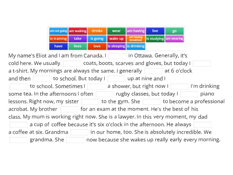 My name's Eliot and I am from Canada. I ____ in Ottawa. Generally, it's cold here. We usually ____ coats, boots, scarves and gloves, but today I ____ a t-shirt. My mornings are always the same. I generally ____ at 6 o'clock and then ____ to school. But today I ____ up at nine and I ____ to school. Sometimes I ____ a shower, but right now I ____ I'm drinking some tea. In the afternoons I often ____ rugby classes, but today I ____ piano lessons. Right now, my sister ____ to the gym. She ____ to become a professional acrobat. My brother ____ for an exam at the moment. He's the best of his class. My mum is working right now. She is a lawyer. In this very moment, my dad ____ a cup of coffee because it's six o'clock in the afternoon. He always ____ a coffee at six. Grandma ____ in our home, too. She is absolutely incredible. We ____ grandma. She ____ now because she wakes up really early every morning.