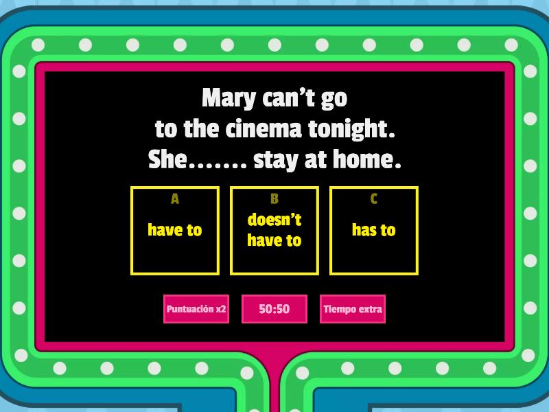 1) Mary can't go to the cinema tonight. She....... stay at home. a) have to b) doesn't have to c) has to 2) My parents can't go to Italy this year. They ......... work this summer. a) don't have to b) have to c) has to 3) My friends are artists so they ............... learn to fly. a) doesn't have to b) has to c) don't have to 4) Caroline ........ wash her car today because it's raining. a) doesn't have to b) has to c) don't have to 5) Sorry, I can't play football tomorrow. I ......... play hockey. a) don't have to b) have to c) has to 6) Peter ....... read a lot of books because he is in the university. a) doesn't have to b) has to c) have to 7) That woman ........ to carry all the bags. Her husband can help her. a) has to b) have to c) doesn't have to 8) You ......... buy a sweater because it's very cold. a) don't has to b) have to c) doesn't have to 9) Children ......... run in the corridors at school. a) don't have to b) doesn't have to c) has to 10) My mother ........... go to the shopping centre because she needs a new bag. a) doesn't have to b) has to c) have to 11) You ........ to go to the park because it's very windy. a) has to b) don't have to c) doesn't have to 12) Teresa can't see very well so she........ wear glasses. a) have to b) doesn't have to c) has to 13) Paul ......... play football on Monday because he is a very important player. a) doesn't have to b) has to c) don't have to 14) My pet ........... go for walks because we have a big garden. a) doesn't have to b) has to c) don't have to 15) My best friend isn't good at Mathematics so she ......... work harder. a) have to b) doesn't have to c) has to 16) My grandparents .......... go to the cinema because they have a big TV at home.   a) doesn't have to b) don't have to c) have to