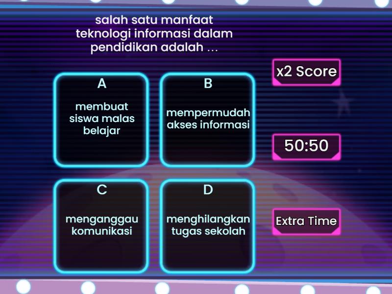 1) salah satu manfaat teknologi informasi dalam pendidikan adalah … a) membuat siswa malas belajar  b) mempermudah akses informasi c) menganggau komunikasi d) menghilangkan tugas sekolah 2) berikut adalah ciri informasi hoaks adalah … a) berisi data lengkap  b) disertai bukti c) mengandung unsur provokasi d) ditulis oleh ahli 3) cara memverifikasi informasi adalah ... a) membaca komentar b) membagikan langsung c) mencari sumber resmi d) menanyakan ke teman 4) bagian dari CPU yang dapat mengolah data aritmetika dan data logika adalah … a) Control Unit b) Register c) Processing Unit d) Arithmetic Logic Unit 5) Microsoft word, instagram, shopee termasuk jenis perangkat lunak … a) sistem operasi b) aplikasi c) firmware d) utilitas 6) Apa fungsi pengalamatan memori ? a) menghapus data dari RAM b) mengakses lokasi penyimpanan data c) mengatur resolusi layar d) mengubah sistem operasi 7) Sistem yang menghubungkan beberapa komputer untuk berbagi informasi (data) dan sumber daya disebut … a) perangkat komputer b) sistem komputer c) jaringan komputer d) koneksi komputer 8) Dalam konfigurasi jaringan, perangkat yang berfungsi mengalihkan data antar perangkat dalam jaringan adalah … a) switch b) scanner c) flashdisk d) monitor 9) Routing pada jaringan komputer berfungsi untuk … a) mencetak data ke printer b) menyimpan data di cloud c) menentukan jalur terbaik untuk data d) menghapus cache internet 10) Perangkat-perangkat yang saling terhubung melalui jaringan komputer dapat digambarkan secara abstrak sebagai hubungan antara … a) node dan router b) node dan link c) node dan switch d) switch dan link 11) Suatu mekanisme pengiriman dan penerimaan data dari satu perangkat ke perangkat lain disebut … a) komunikasi data b) distribusi data c) pengolahan data d) transfer data 12) Perbedaan utama antara LAN dan internet adalah … a) LAN lebih mahal dari internet b) Internet bersifat lokal, LAN global c) LAN terbatas dalam jangkauan, internet tidak terbatas d) LAN tidak menggunakan kabel 13) jaringan lokal (LAN) biasanya digunakan untuk … a) menghubungkan komputer antarnegara b) mengakses internet global c) menghubungkan komputer dalam satu gedung d) menghubungkan ponsel dengan satelit 14) Facebook, Instagram, dan twitter termasuk media sosial … a) berbasis dokumen b) bookmarking c) blogging d) jejaring sosial 15) Ciri dari website phishing adalah … a) desain menarik dan resmi b) URL mencurigakan dan tidak wajar c) banyak iklan produk illegal  d) dikelola pemerintah resmi 16) RAM berfungsi untuk … a) menyimpan data secara permanen  b) menyimpan data sementara c) mengatur tampilan layar d) meningkatkan resolusi gambar 17) Contoh perangkat lunak sistem operasi adalah ... a) instagram b) google chrom c) photoshop d) windows 18) fungsi alamat IP dalam jaringan komputer adalah ... a) meningkatkan sinyal b) menghubungkan ke internet c) mengidentifikasi perangkat dalam jaringan d) menyimpan data pengguna 19) perangkat yang menghubungkan jaringan lokal dengan internet adalah … a) switch b) repeater c) router d) VGA card 20) Saat berada di ruang bawah tanah atau basement, kekuatan sinyal yang diterima ponsel akan … a) lemah b) kuat c) normal d) stabil 21) Jika alamat memori suatu data ada di 00B8:0013, maka alamat fisiknya adalah... a) 00CB b) 00DC c) 00BE d) 00EC 22) Diasumsikan bahwa jika jarak HP dan BTS terdekat lebih kecil dari 8 meter, HP akan mendapatkan sinyal yang kuat. Maka HP mana saja yang memiliki sinyal kuat ? a) HP 1, HP 3, HP 5 b) HP 3 dan HP 4 c) HP 1, HP 3, HP 4 d) HP 1 dan HP 3 23) Pada node mana sajakah perangkat komputer diletakkan jika akan dibuat konfigurasi jaringan komputer ? a) 0, 3, dan 7 b) 1, 2, dan 5 c) 3, 4, dan 8 d) 4, 7, dan 8 24) Bentuk cyberbullying yang sering terjadi adalah … a) like foto teman b) menyebar rumor jahat c) mengirim hadiah virtual d) memberi komentar positif