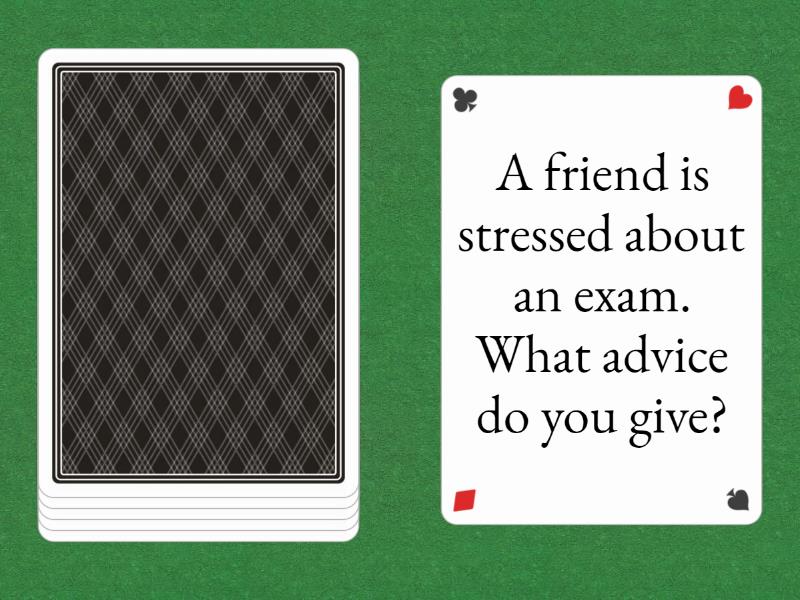 : When do you get stressed?, If you're late, what does the teacher say?, What do you do if you don't understand something?, A friend is stressed about an exam. What advice do you give?, What does the principal do if you do something wrong?, What does your teacher say if a student forgets their homework?,